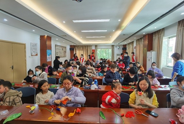活动在金洲社区拉开帷幕,共有22组家庭参加了活动。福州市社区大学师资库专业老师与福州职业技术学院建筑工程学院大学生志愿者一同为居民朋友们示范讲解丝网花的制作过程,指导大家以家庭为单位亲子共同制作丝网花。并在丝网花制作完成后,携小朋友走进社区进行义卖。