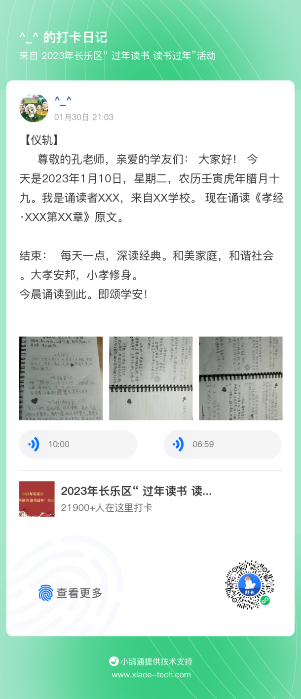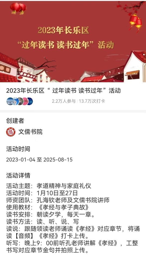 孝道是传统文化的根基,是做人的根本。在长乐区委区政府的指导下,于2023年1月10日至27日间长乐区教育局与福州市社区大学文儒学院联袂组织“孝道精神与家庭礼仪”为主题的“过年读书,读书过年”活动,长乐区各校师生、家长2.2万人积极参与线上共学《孝经》、抄写金句,累计13.7万次打卡。