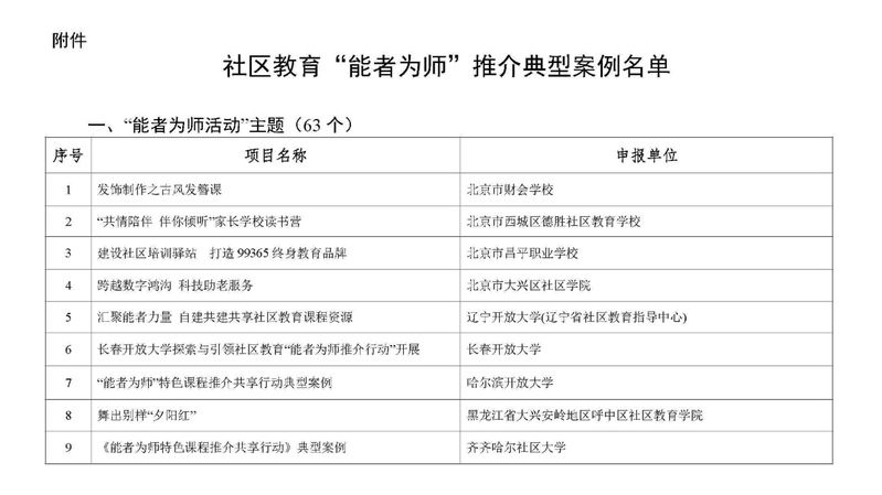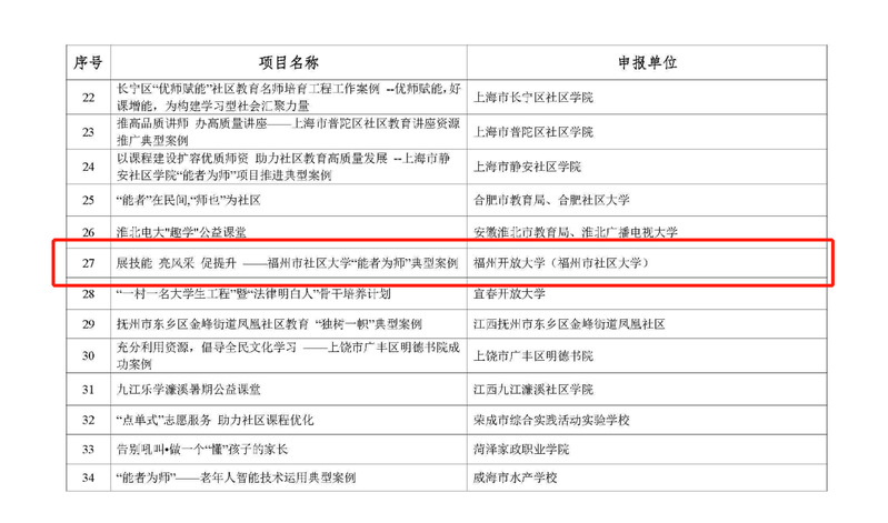 2022年12月26日,教育部职业教育与成人教育司发布《关于公布社区教育“能者为师”推介典型案例的公告》,福州市社区大学“展技能 亮风采 促提升”典型案例成功入选。