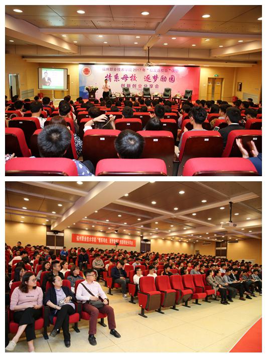 2017年4月14日下午,福州职业技术学院2017年校友返校日活动之“情系母校逐梦励园”创新创业分享会在学术报告厅成功举办。福州职业技术学院党委书记陈承茂,学生工作处处长、创新创业教育办公室主任刘春兰,学生工作处、创新创业教育办公室全体工作人员,优秀校友代表,各系校友联络员、创业团队、学生代表共约300人欢聚一堂,畅谈创业故事,分享成长心路历程。