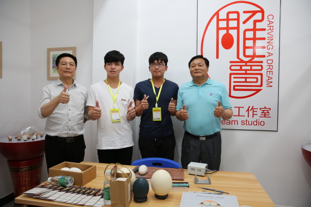 谢友平处长、李秋斌校长与“雕梦蛋雕工作室”成员合影