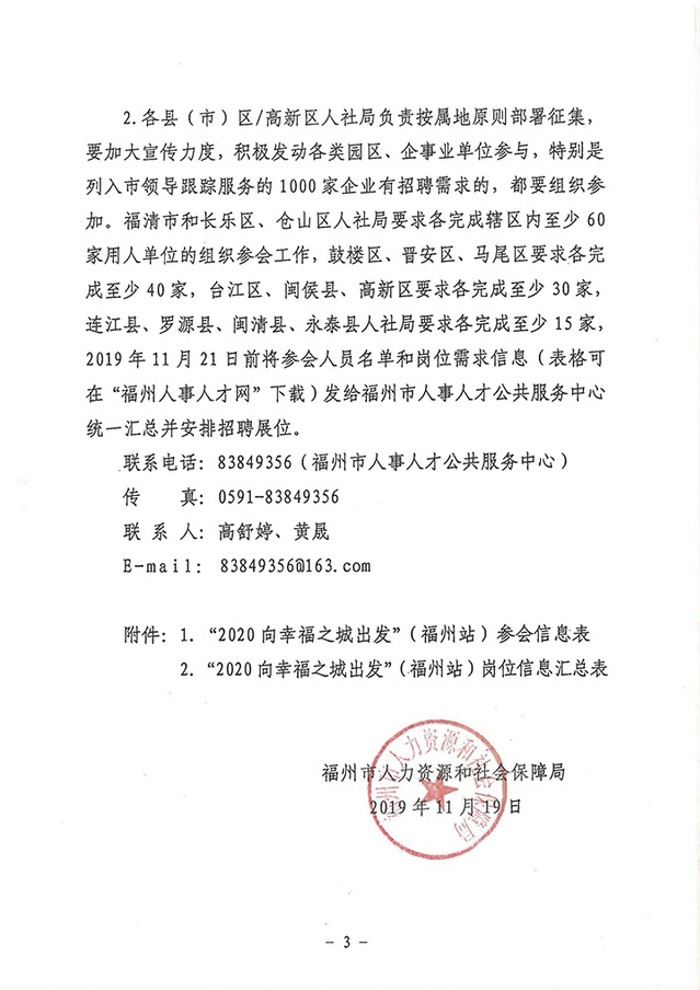 为切实解决我市重点企事业单位人才需求问题,鼓励在榕高校毕业生留榕就业,福州市人力资源和社会保障局、福州市妇女联合会、福州大学将于近期联合举办“‘向幸福之城出发’2020年福州引才校园行(福州站)专场招聘会”。届时,将吸引福州大学、福建师范大学、福建工程学院、福建农林大学等多所高校大量毕业年度学生到场。现就有关事项通知如下: