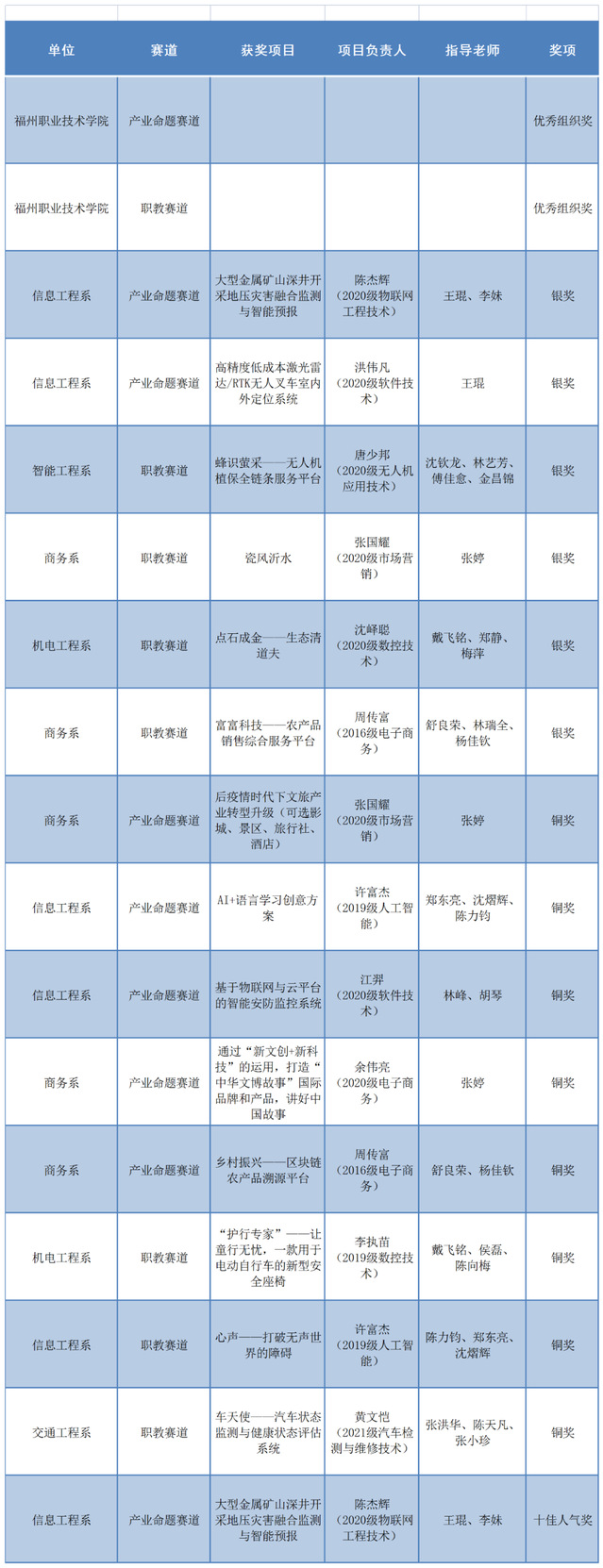 近日,福建省教育厅公布第八届福建省“互联网+”大学生创新创业大赛获奖名单,我校取得银奖6项、铜奖8项、十佳人气奖1项的好成绩,并获得产业命题赛道优秀组织奖和职教赛道优秀组织奖。