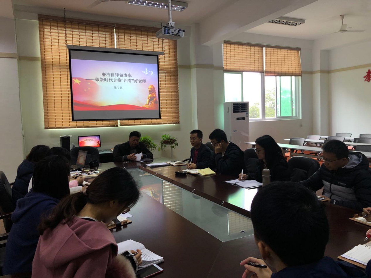 陈宝龙书记围绕:加强政治学习,提高党性修养,筑牢思想防线;固守政治底线,做清正廉洁表率,坚持洁身自律;为人师表、廉洁从教,认真履职尽责等三个方面展开。同时,结合《永远在路上》廉政教育警示片,对教育系统腐败案例进行点评和分析,讲述了鲜活的监督执纪故事,警示教育党员领导干部要严守政治纪律和政治规矩,筑牢理想信念的根基。他希望广大党员:一是在工作和生活中严格要求自己,切实加强党性修养,防微杜渐,踏实工作,认真履行好教书育人的岗位职责,永葆廉洁本色;二是要牢固树立正确的价值观、金钱观,怀着一颗感恩的心,敬畏组织、敬畏法律、敬畏权力,廉洁执教。