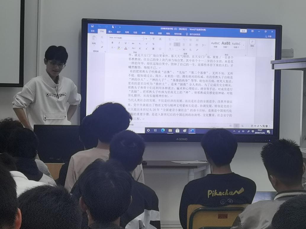 班会首先向同学们介绍了宪法的基本原则和主要内容、宪法在我们日常生活中的作用以及如何维护宪法的尊严。接着,围绕着宪法对于“邪教”和“毒品”的规定分别向同学们阐释了其危害,让学生们清晰意识到大学生“法制教育”的重要性,引导大学生正确认识社会中的各种套路和手段,教同学们珍爱生命,做一名合格的大学生。最后,对参会同学进行法律知识考试,以加深和巩固同学们的法律常识。