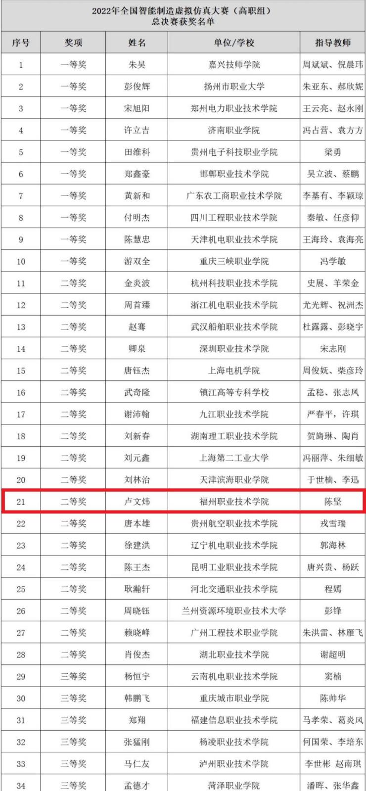 2022年11月12日,由中国自动化学会主办的2022年全国智能制造虚拟仿真大赛(高职组)总决赛圆满落下帷幕。来自全国13个省(自治区、直辖市)的80多名入围选手进行了激烈的角逐,我系2020级工业机器人技术专业卢文炜同学荣获全国二等奖,指导老师陈坚。