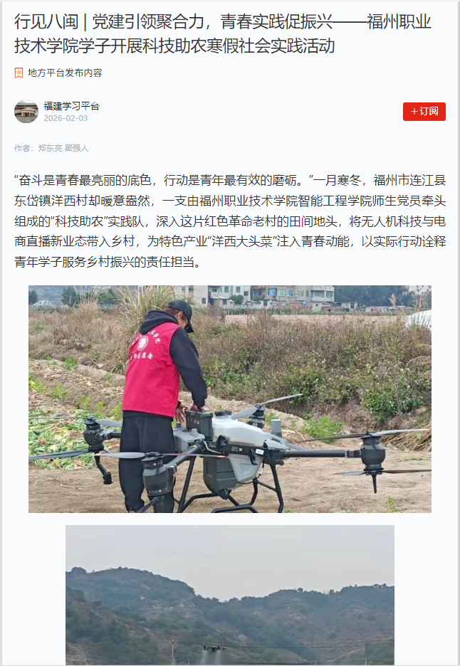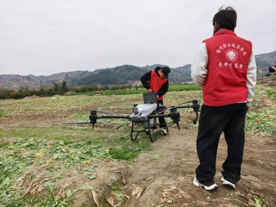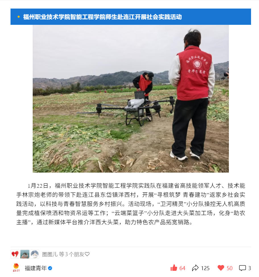 把课堂搬进田野,让技术扎根泥土。1月22日,“卫河精灵”小分队在福建省高技能领军人才、技术能手林宗炮老师带的领下赴连江县东岱镇洋西村,在“大头菜”地开展无人机植保作业及物资吊运,用无人机应用技术为乡村振兴注入青春智慧与技术能量。林宗炮老师现场为村干部与农户讲解无人机技术在智慧农业中的应用前景与效率优势,将一堂生动的“移动专业课”开在了生产一线。“把课堂搬到田间地头,才真正懂了‘学以致用’的意义。”实践队队员游昌平感慨道。队员们纷纷表示,大家感受到农业生产的艰辛,更体会到科技赋能的价值。