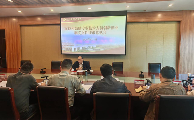 2026年4月1日,饶校长主持召开支持和鼓励专业技术人员创新创业的文件制度征求意见会,人事处牵头组织,教务处、科技处、各学院教师代表参会,就相关政策展开研讨,广泛听取教师代表对双创工作的意见建议。
