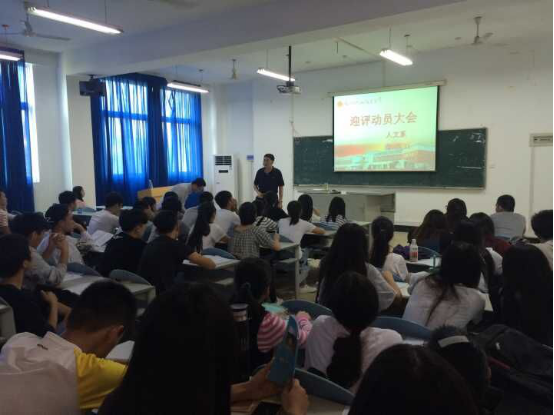 为迎接我院第二轮人才培养工作评估,11月18日中午人文系在综合楼310大教室召开迎评工作培训会。系总支书记贾同恩同志主持,各班学生干部及辅导员120余人参加会议。
