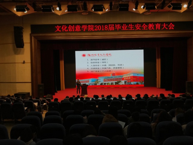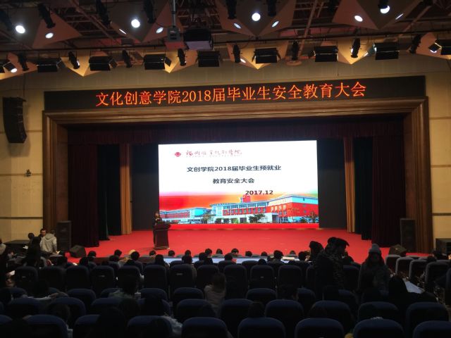 为积极配合学校迎接2017年福州市综治安全责任目标管理现场考评工作,我院结合毕业班学生离校前实习就业指导工作,于20171211日晚,在我校500人礼堂举办文化创意学院2018届毕业班学生安全教育大会暨毕业班学生实习就业指导动员会,我院全体2018届毕业班学生和带班辅导员出席会议。