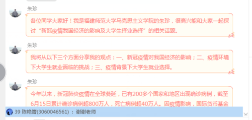 2020622日,文化创意学院邀请福建师范大学马克思主义学院朱珍博士分为别会展策划与管理专业181班及2班讲授“新冠疫情对我国经济的影响及大学生择业选择”的提报告。