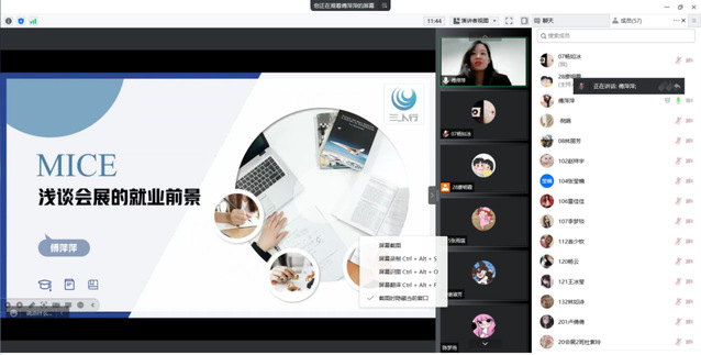 因疫情防控原因,傅萍萍老师不能到达现场为同学们演讲,老师深以为憾,为此,在腾讯会议上召开了就业相关专题讲座。在讲座上,傅萍萍老师的演讲深深感染着每一位同学,向同学们分享了自己丰富的会展工作经历以及对会展就业前景进行分析,并对同学们提出了以下几点就业建议:第一,希望同学们在未来就业时扩大知识面,不要仅限于课本上的知识点,要把理论的知识与实践相结合,提升专业能力;第二,在工作中要敢于吃苦,在面对困难和磨难的时候,不要轻易放弃;第三,进入社会工作后要忘记掉自己学生的身份,认真的对待每一个项目,要对每一项项目负责。会展行业需要工匠,傅老师基于行业基层职业素养,一个个鲜活的案例,激发会展学生的就业激情,点燃会展学生的职业热情。