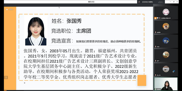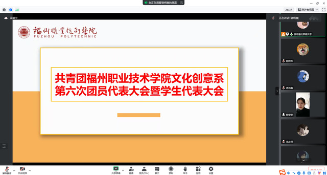 福州职业技术学院文化创意系第六次团员代表大会暨学生代表大会于2022年12月17日通过线上形式顺利召开。