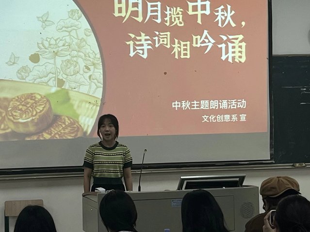 为弘扬中华优秀传统文化,营造中秋节日氛围,文化创意系于9月27日晚举办“明月揽中秋,诗词相吟诵”朗诵比赛活动。