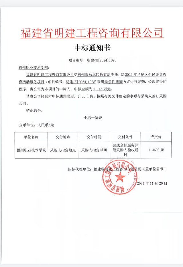 1120日,文化旅游学院成功中标2024马尾区全民终身教育活动服务项目,项目金额为114600元,我院凭借专业的师资队伍、丰富的教学资源和先进的教育理念,在众多竞争者中脱颖而出,这一成绩充分展现了我院强大的社会服务能力。通过此次项目,我院将为马尾区居民提供多元化的终身教育课程,涵盖送教下基层课程马尾区街道人员技能培训教学成果展示等,为社区居民带来丰富的讲座、培训、文艺汇演等多样化的活动,满足不同人群的学习需求。