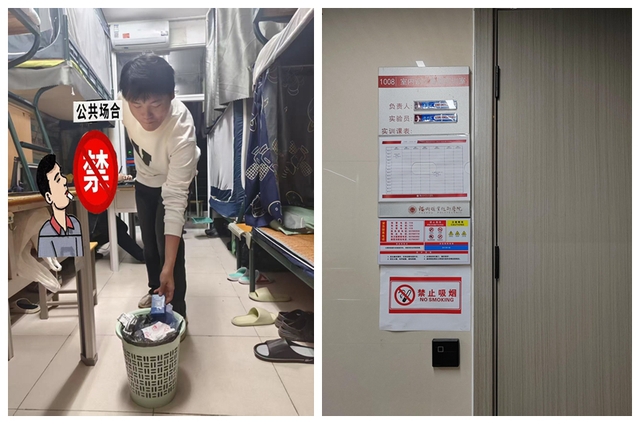 图4 于教室、宿舍区域张贴禁烟标识,劝导学生戒烟