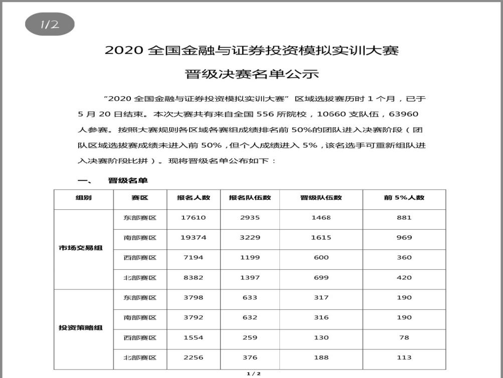 本次比赛是以证券业为背景,基于证券从业者所具备的行业知识、基本业务技能及实操技能等设计的综合实训大赛,各区域各赛组成绩排名前50%的队伍可进入决赛。来自全国556所院校,10660支队伍,63960人参赛。其中,商学院参与的东部赛区共晋级队伍数1468支,投资与理财专业派出参赛的19支队伍在张彬老师的指导下全部晋级总决赛。(图文/杨少慧)