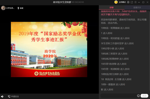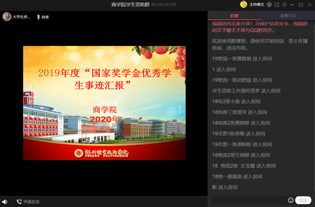 6月28日,商学院在线上开展国家奖学金、国家励志奖学金优秀学生事迹汇报会。2019年度商学院共有3名学生获得国家奖学金、59名学生获得国家励志奖学金。本次汇报会他们从学习、工作、生活等方面介绍各自奋斗历程,号召广大同学珍惜韶华、勤勉学习、刻苦奋斗,争取获得优异成绩。