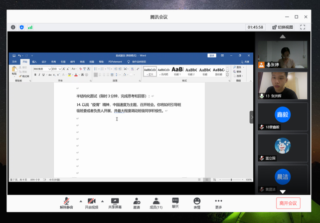 近日,商学院通过腾讯会议、QQ群等线上平台进行了新生助导面试选拔,辅导员许艺妍、张婷主持本次选拔活动,42位2020级助导候选同学参与选拔。