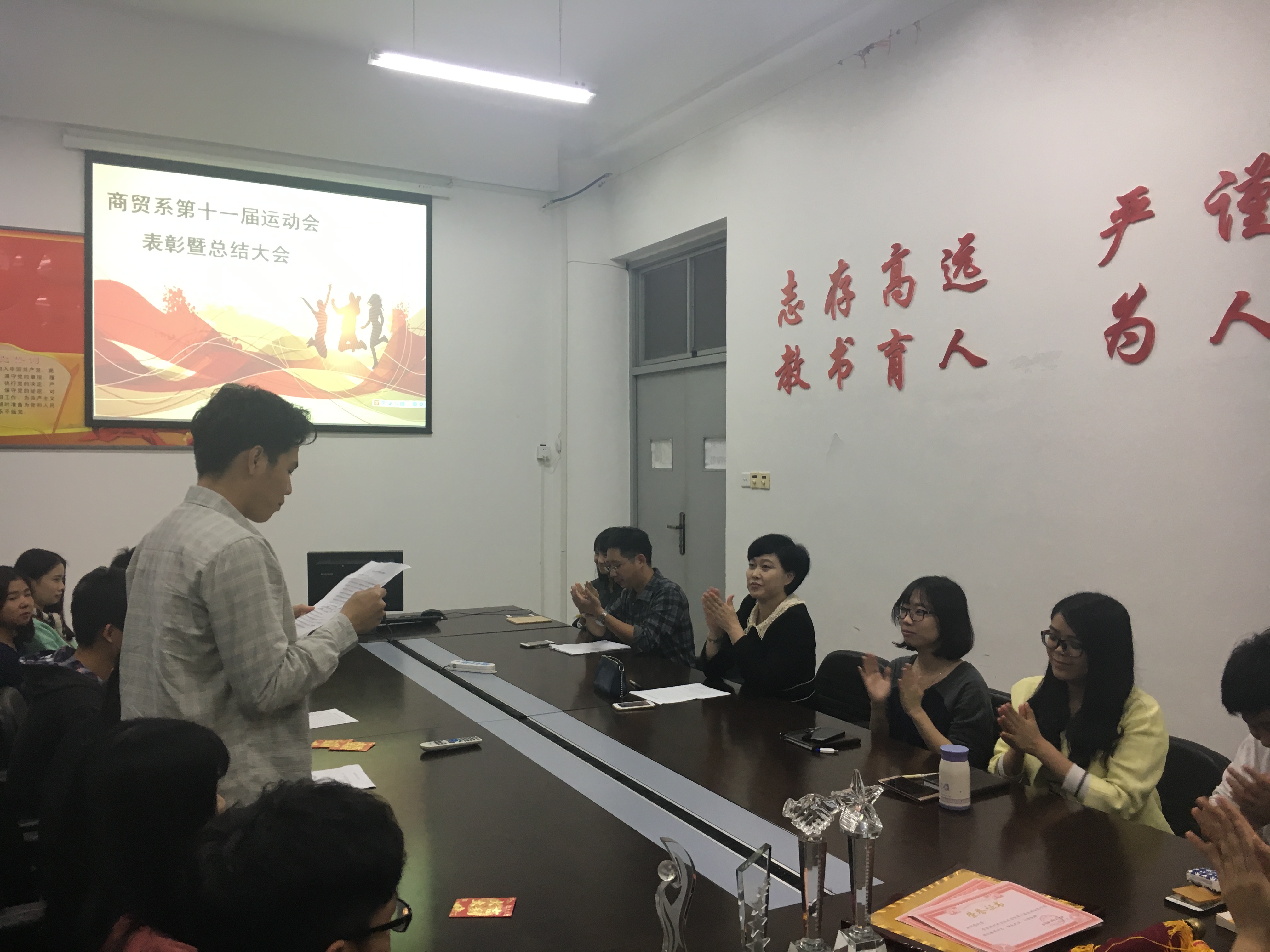 11月22日晚,商贸系运动会表彰暨总结大会于2#513会议室召开。参加此次大会的有商贸系党总支副书记、辅导员、两委干事以及各运动项目负责人。