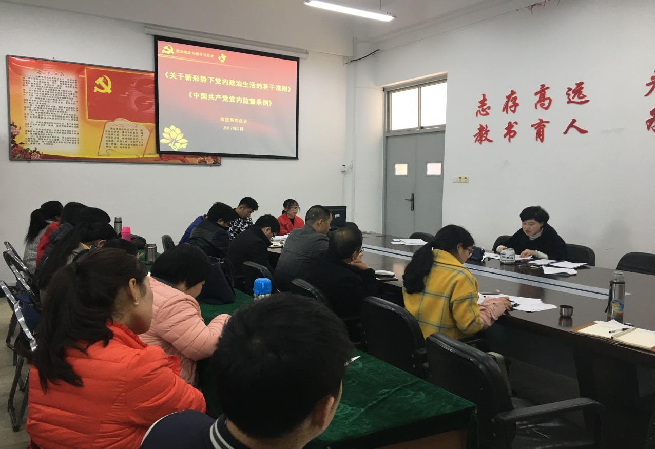 按照学院党委部署,商贸系党总支进一步深入学习贯彻党的十八届六中全会精神,落实全面从严治党要求,于2017年3月15日中午,组织全系教职工党员学习《关于新形势下党内政治生活的若干准则》和《中国共产党党内监督条例》(以下简称《准则》和《条例》)。