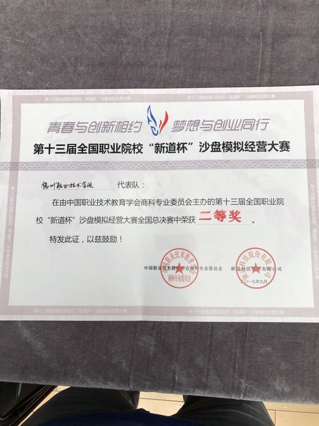 2017年9月16日至17日,第十三届全国职业院校“新道杯”沙盘模拟经营大赛全国总决赛在甘肃白银矿冶职业技术学院举行,来自全国29个省、直辖市的102支参赛队展开激烈的比拼。商学院学生程海淇、陈铭浚、张若梅、李思婕、黄梦娇在张兴夏老师的指导下,经过紧张激烈的角逐,我院代表队奋勇拼搏,力战强敌,最终获得二等奖,创造佳绩。