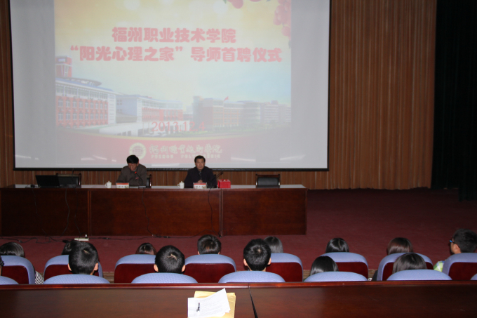 2013年12月4日下午,院“阳光心理之家”导师首聘仪式在500人礼堂内隆重举行。首聘仪式由学院党委副书记林福荣主持,学院党委书记陈承茂向10位导师发放聘书并做了重要讲话,学生处、团委、保卫科负责人,各系(院)书记、辅导员、阳光心理之家导师团队成员、院、系学生两委、学生心理社团成员、班级心理委员近500人参加了首聘仪式。