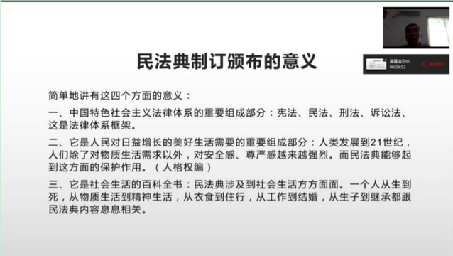 为深入学习贯彻习近平总书记重要讲话精神,充分认识颁布实施《民法典》的重大意义,熟读这部涉及社会和经济生活方方面面的“百科全书”,2020年6月24日,马克思主义学院开设空中法律讲坛,由张章盛副教授专题解读《民法典》基础知识。马克思主义学院、机器人学院、文化创意学院、特殊教育学院全体教职员工、马院习近平新时代中国特色社会主义思想读书社成员等近100人参加了专题讲座。