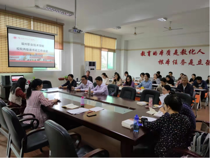 20211020日,马克思主义学院在红色书屋召开2021-2022学年校院两级读书社工作会议。宣传部负责人念航、马克思主义学院负责人林岩清、校级读书社指导老师以及各二级学院读书社联络员、读书社骨干学生参加。