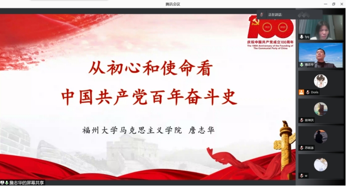 11月12日,我校习近平新时代中国特色社会主义思想大讲坛第八讲线上开展,特邀福州大学马克思主义学院执行院长詹志华教授作“从初心和使命看中国共产党百年奋斗史”专题讲座。马克思主义学院全体教师、校院两级习近平新时代中国特色社会主义思想读书社成员共120余人聆听讲座。