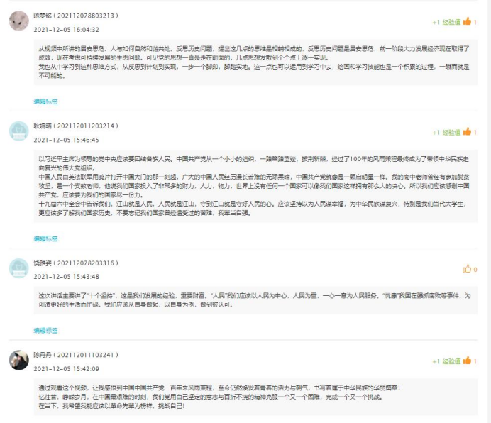同学们表示通过本次学习会,要把学习好、宣传好、贯彻好、落实好党的十九届六中全会精神,与开展党史学习教育结合起来,持续从党的百年奋斗史中汲取智慧和力量,以史为鉴、开创未来、实干笃行,以只争朝夕的精神投入学习中,在新时代新征程上展现新气象新作为,无愧今天的使命担当,不负明天的伟大梦想。