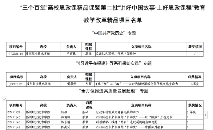 近日,中共福建省委教育工委关于公布“三个百堂”高校思想政治理论课精品课遴选结果的通知(闽委教思〔2021〕29号),我院六个项目荣获“三个百堂”高校思想政治理论课精品课暨第二批“讲好中国故事·上好思政课程”教育教学改革精品项目立项,其中杨颖、黄若然项目荣获三等奖。