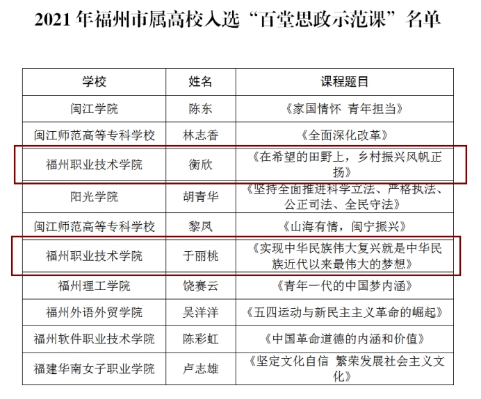 根据《福州市教育局关于遴选建设百堂思政示范课暨开展巡讲活动的通知》(榕教思〔2021〕32号)文件精神,经市属高校思政课教学协作中心组织评选,我院衡欣、于丽桃课程入选福州市百堂思政示范课。