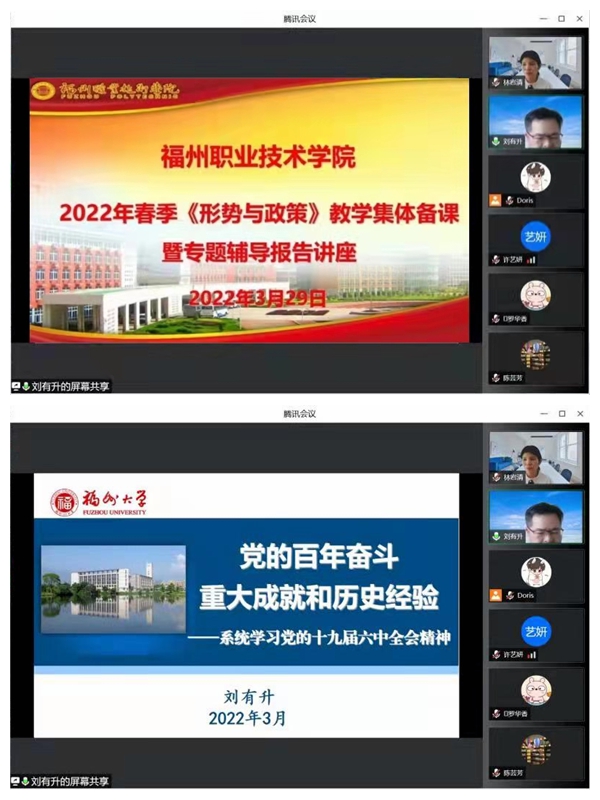 3月29日,马克思主义学院《形势与政策》课程教研室通过腾讯会议开展第二次集体备课。此次集体备课会邀请到了福州大学刘有升教授做教学要点解读暨专题辅导报告,会议由马克思主义学院院长林岩清主持,全体《形势与政策》课程专兼职教师参加会议。