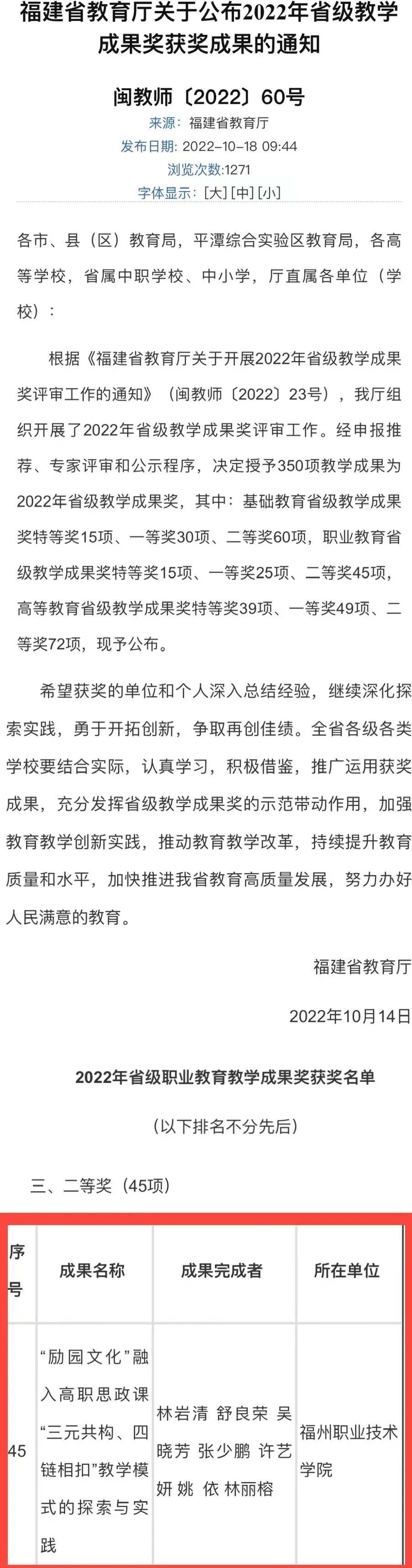 日前,省教育厅印发《关于公布2022年省级教学成果奖获奖成果的通知》。经申报推荐、专家评审和公示程序,福州职业技术学院马克思主义学院申报的《“励园文化”融入高职思政课“三元共构、四链相扣”教学模式的探索与实践》教学成果荣获2022年省级职业教育教学成果奖二等奖(团队成员:林岩清、舒良荣、吴晓芳、张少鹏、许艺妍、姚依、林丽榕)。