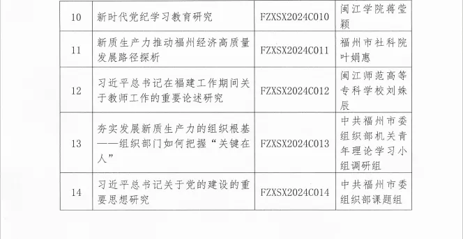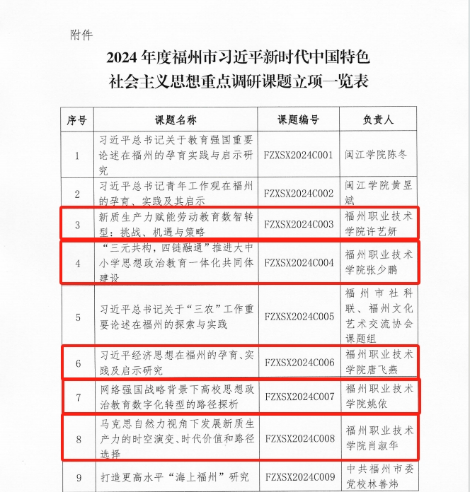 近日,福州市习近平新时代中国特色社会主义思想学习研究小组公布了2024年度重点调研课题的立项名单。据《关于2024年度福州市习近平新时代中国特色社会主义思想重点调研课题立项的通知》(榕学研办〔20248号)通知,全市共立项14项,其中我院申报课题中有5项成功立项,立项数量位列第一。