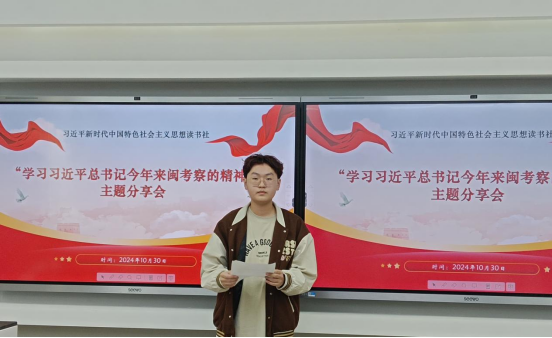1030校习近平新时代中国特色社会主义思想读书社在至善楼303组织“学习贯彻习近平总书记来闽考察重要讲话精神”主题分享会。在党的二十届三中全会胜利闭幕不久,在新福建建设10周年的新起点上,习近平总书记回到福建考察并发表重要讲话,强调要扭住目标不放松,一张蓝图绘到底,在中国式现代化建设中奋勇争先。习近平总书记的重要讲话校读书社师生群体中引起热烈反响。