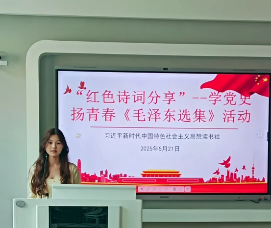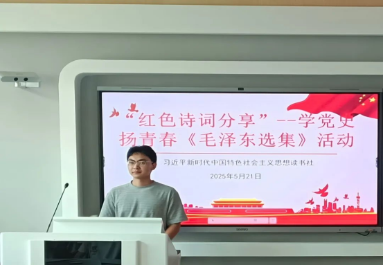 为加强同学们对党史的了解、激发爱国热情,我校习近平新时代中国特色社会主义思想读书社于5月21日在至善楼303开展“学党史、扬青春”《毛泽东选集》--红色诗词分享会活动。
