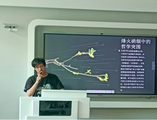 活动中,实践部的朱颖同学分享了毛泽东的经典诗词《七律・长征》,用生动的语言描绘了红军战士在长征途中跨越千山万水的艰难险阻,展现出他们坚韧不拔的意志和英勇无畏的革命精神;秘书部的郑金杰同学详细阐述了《毛泽东选集》中蕴含的深邃思想是如何在特定的历史背景下形成与发展的;宣传部的黄冬燕同学则以《星星之火,可以燎原》为例,通过详实的历史资料和清晰的逻辑讲解,让同学们明白了在革命最艰难的时期,毛泽东同志如何以敏锐的洞察力和坚定的信念,为中国革命指明了前进的方向,让星星之火终成燎原之势。