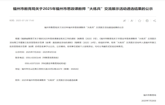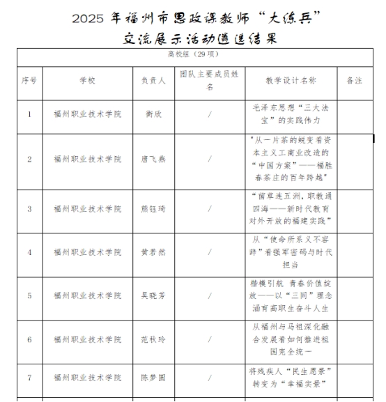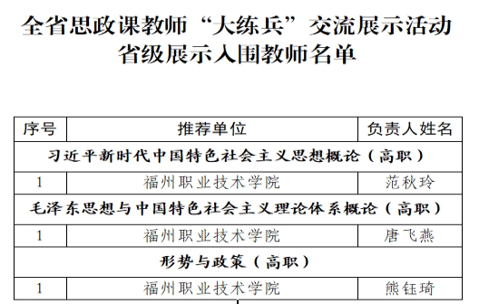 在福州市思政课教师“大练兵”交流展示活动遴选结果的公示中,我校报送的七堂思政课全部入选福州市第三批百堂思政示范课(金课)的项目名单,入选数量居全市院校首位。