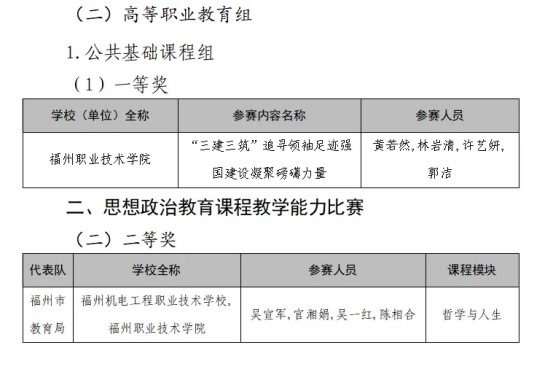 近日,2025年福建省职业院校技能大赛教学能力比赛(含中职思政)公布获奖名单,我院斩获福建省教学能力大赛一等奖1项、二等奖1项。