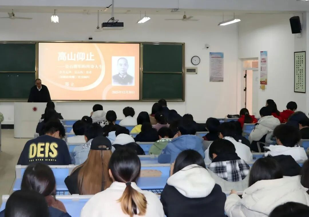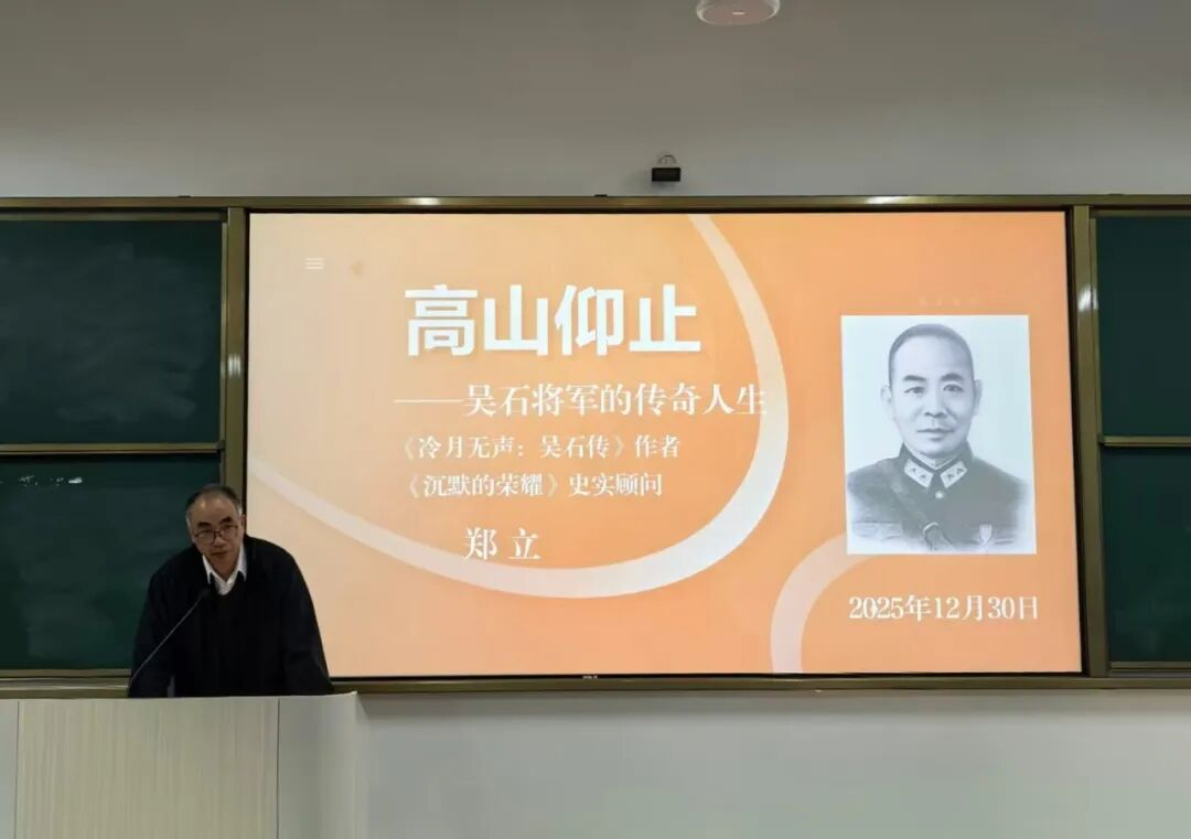 之后,郑立老师进行《高山仰止——吴石将军的传奇人生》专题讲座。郑立老师深耕吴石烈士研究多年,著有《冷月无声——吴石传》等权威著作。他以深厚的乡梓情怀和严谨的史学视角,将“英雄福州城 血性福州人”的主题贯穿始终,深情讲述了吴石将军作为福州儿女的卓越代表,其波澜壮阔的一生。讲座不仅详述了吴石将军在抗战与解放事业中的不朽功勋与英雄壮举,也讲述了与之并肩的陈宝仓将军以及福州籍烈士聂曦等人的家国情怀。这段与福州紧密相连的尘封历史,因真实而格外震撼,令师生对这片土地所承载的英雄传统,产生了强烈的认同与自豪。