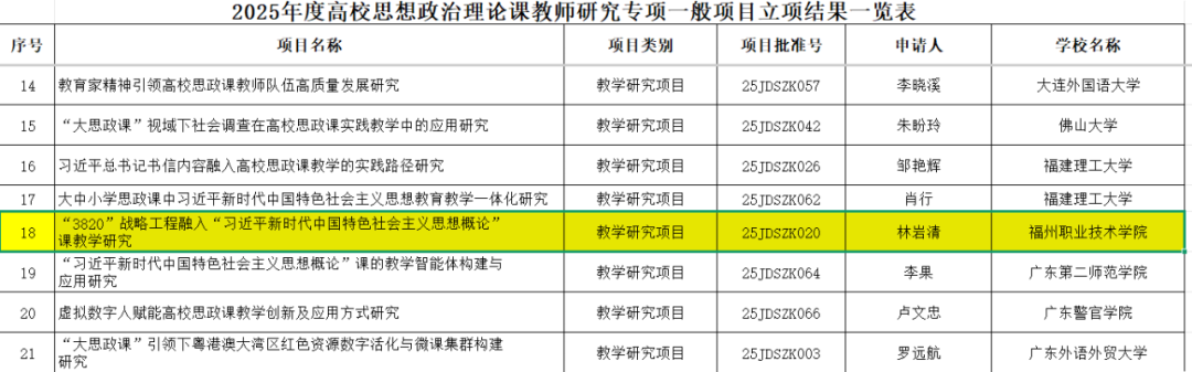 近日,教育部社科司公布2025年度高校思想政治理论课教师研究专项一般项目立项名单,我校马克思主义学院林岩清教授主持的“‘3820’战略工程融入‘习近平新时代中国特色社会主义思想概论’课教学研究”项目成功获批。