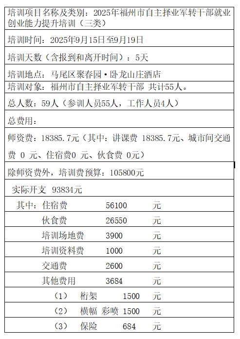 根据《福建省省直机关培训费管理办法》(闽财行(2017)18号)要求,现将2025年福州市自主择业军转干部就业创业能力提升培训(三类培训)开支情况予以公示。公示期5个工作日,2026年3月23日至2026年3月27日,联系电话:15806016327。