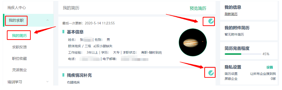 1、登陆www.cdpee.org.cn,并注册残疾人用户账号,在左侧残疾人用户中心“我的求职”中“我的简历”页面,完善个人简历信息。