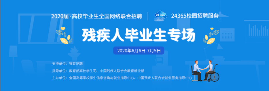 为贯彻落实国务院常务会议关于做好高校毕业生等重点群体就业和全国普通高等学校毕业生就业创业工作电视电话会议精神,切实做好残疾人毕业生就业帮扶工作,实现就业服务精准化、个性化,全国高等学校学生信息咨询与就业指导中心和中国残疾人联合会就业服务指导中心于2020年6月6日-7月5日联合开展2020年高校残疾人毕业生网络招聘会,高校毕业生及用人单位可登陆中国残疾人就业创业网络服务平台 (https://www.cdpee.org.cn/)、教育部大学生就业网(新职业网www.ncss.cn)参与活动。