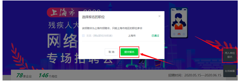 4、在专题页中,点击右侧“用人单位报名”,勾选已经发布的职位后点击“提交报名”,等待职位审核通过即可参会。