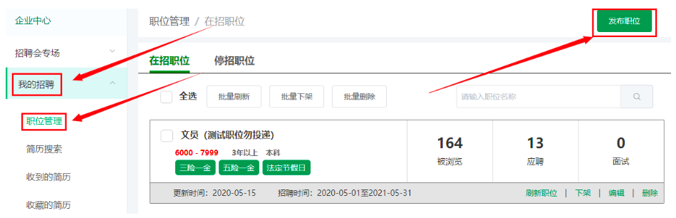 1、登录企业用户账号,在左侧企业用户中心“我的招聘”中“职位管理”点击“发布职位”,