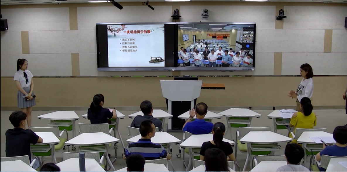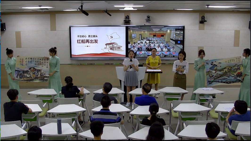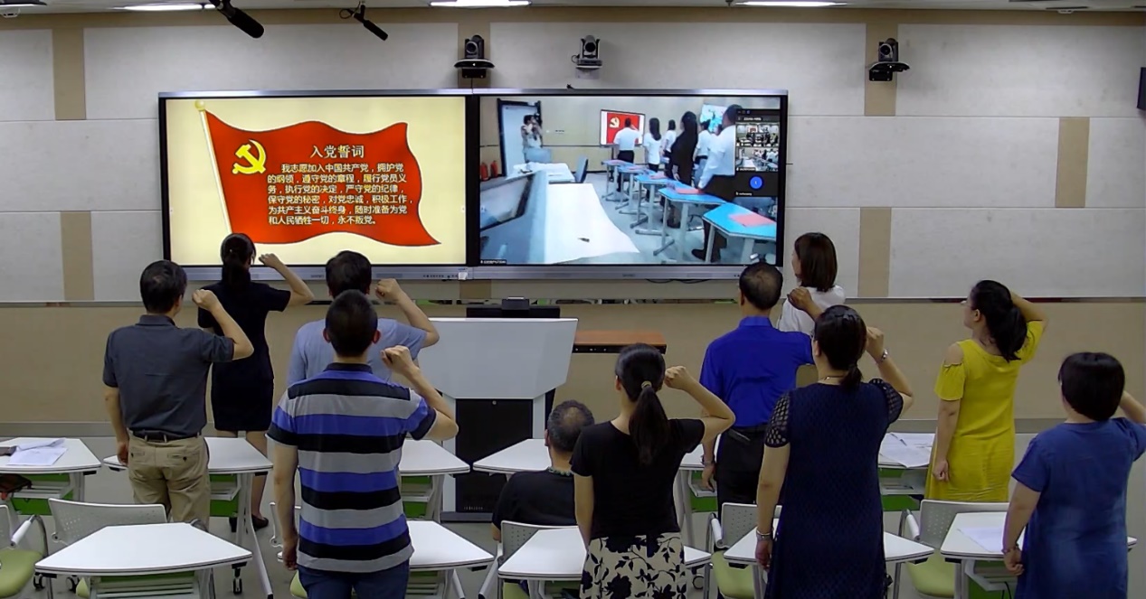 5月28日下午,一场别开生面、形式丰富的主题党日活动在特教楼2楼智慧教室拉开了帷幕。双方通过现场连线,画面清晰展现了两个学校的活动情景,全场主题党日活动让大家感受到了“党味”更浓,党史学习“鲜味”十足。