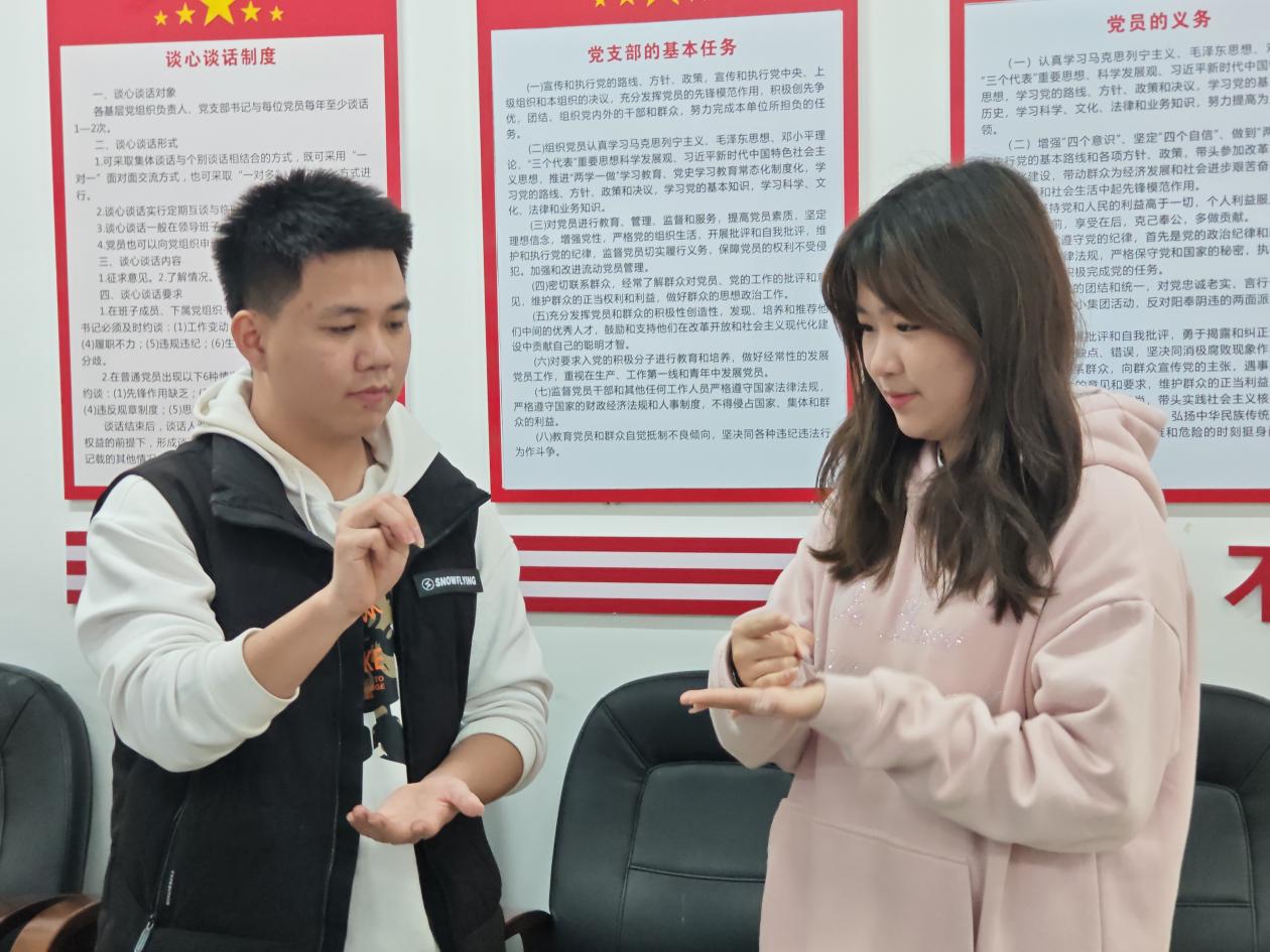 此次手语活动共举办4期,每期选出5位特教学生志愿者向特教系勤工助学健全助理教学手语技能。在每一场活动中,特教志愿者耐心向助理们介绍手语的来源、发展以及每个手语的打法,每一个动作、每一个细节都闪耀着热情与细心,在他们的认真教学下,健全助理们的每一个手势都如同春花绽放,绽放出沟通的力量。特教志愿者们对他们的学习纷纷点赞。“他们竖起的大拇指是对我们最好的褒奖和鼓励。”助理们如是说,“手语学习架起了听障生与健全生沟通的桥梁,增加健全生对手语文化的了解,并为听障学生提供支持和帮助,让我们亲身体验手语交流、传递关爱和友善的力量。”